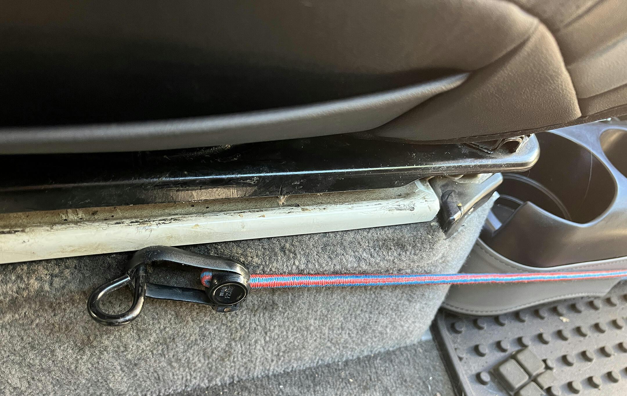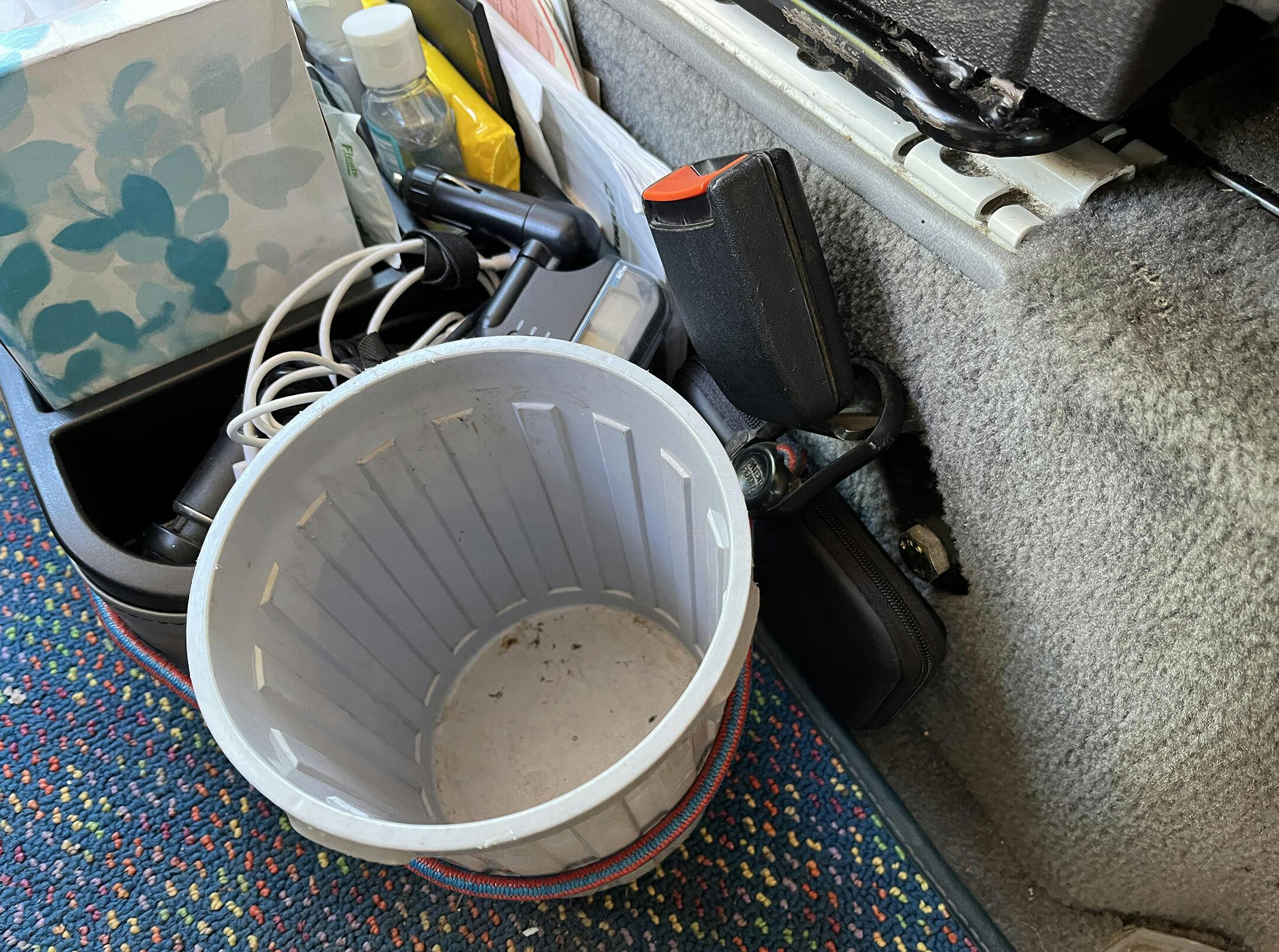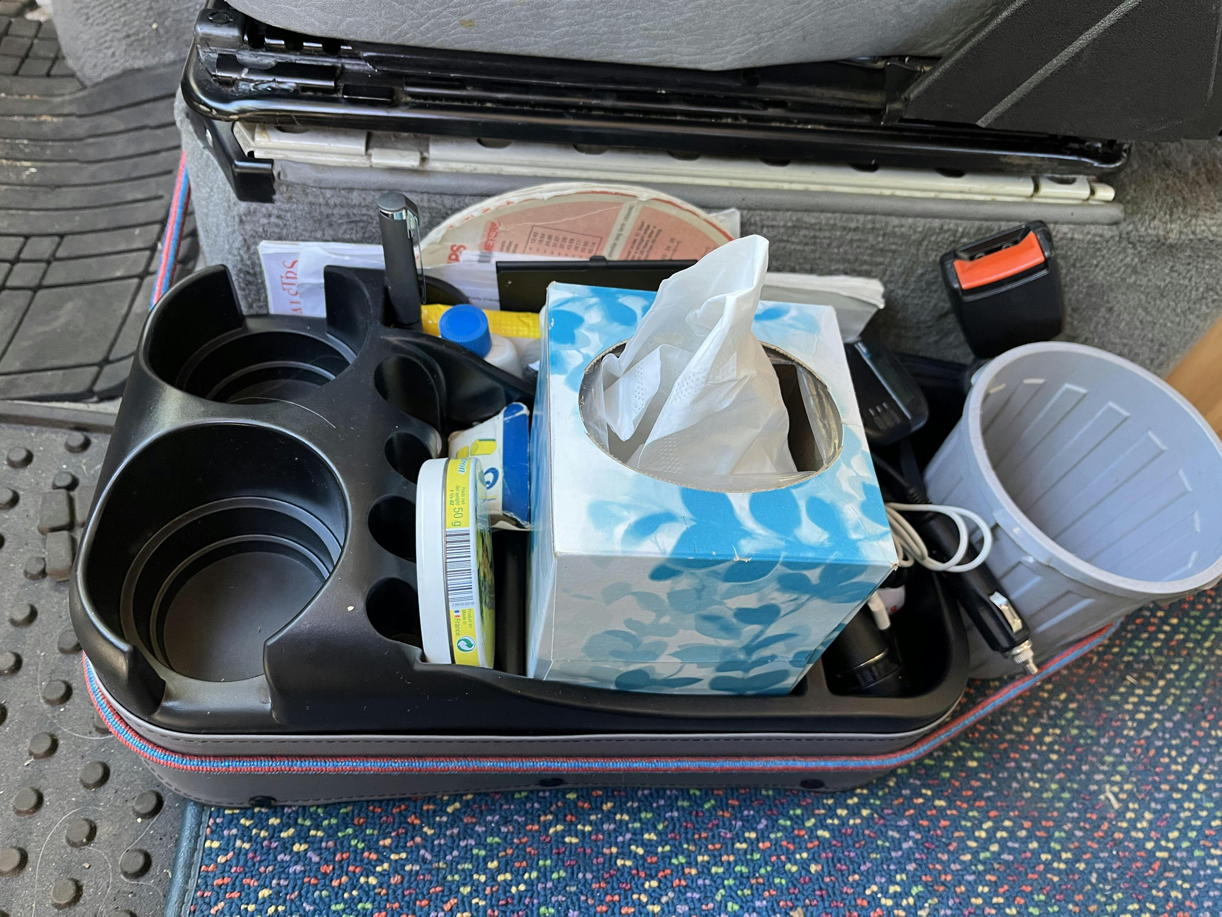 I am very familiar with an organizer like that as it can tip over. But I have a plastic box the same size in the same place for 35 yrs. and I secured it with a bungie cord and it never moved when van in motion. So I just replaced it with this nifty organizer and secured it the same and now my junk is in proper order. I really like the fake leather surround overlay rather than just plain colored plastic. Looks good and works well. See the pix for the placement of the bungie cord.
