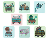 Show your appreciation for Gab Nelson's whimsical Vanagon designs with this 8 coaster set!