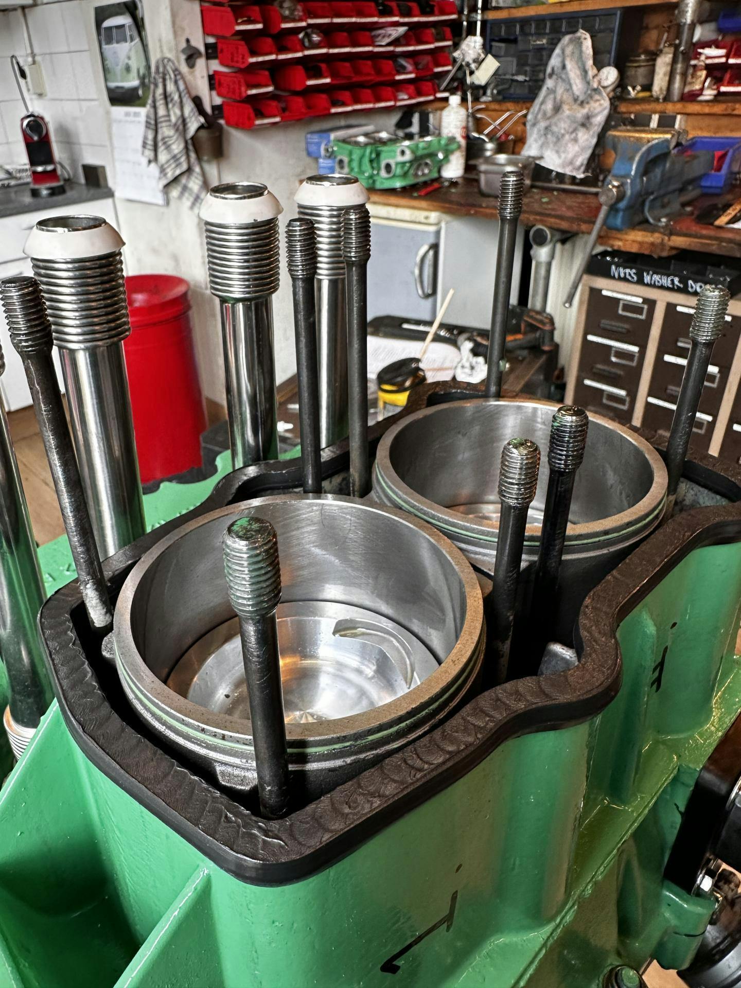 IMPORTANT NOTE: The engine block assembly (case) will need to be hand-machined for added clearance in several places, including (but not limited to) the roof and beneath piston at BDC and back side of the bosses into which the head studs install from the opposite side. The case is made from cast aluminum, and no two are exactly the same. There is no "blue print" or "program" to achieve thisāit has to be done by hand by a very experienced and talented individualāplease read this article for more information. The crankshaft/rod assembly, cylinder, and piston must be test-fitted repeatedly to ensure that the clearance is correct and adequate, while at the same time not going too far and maintaining the cleanliness required for any successful engine rebuild.