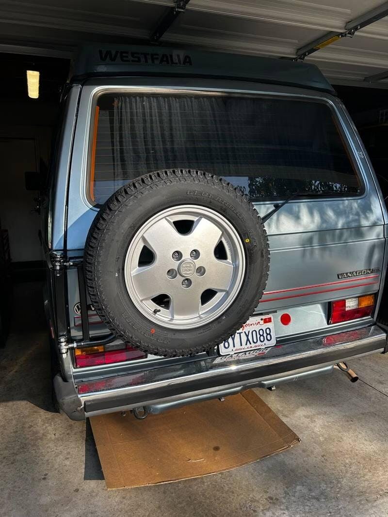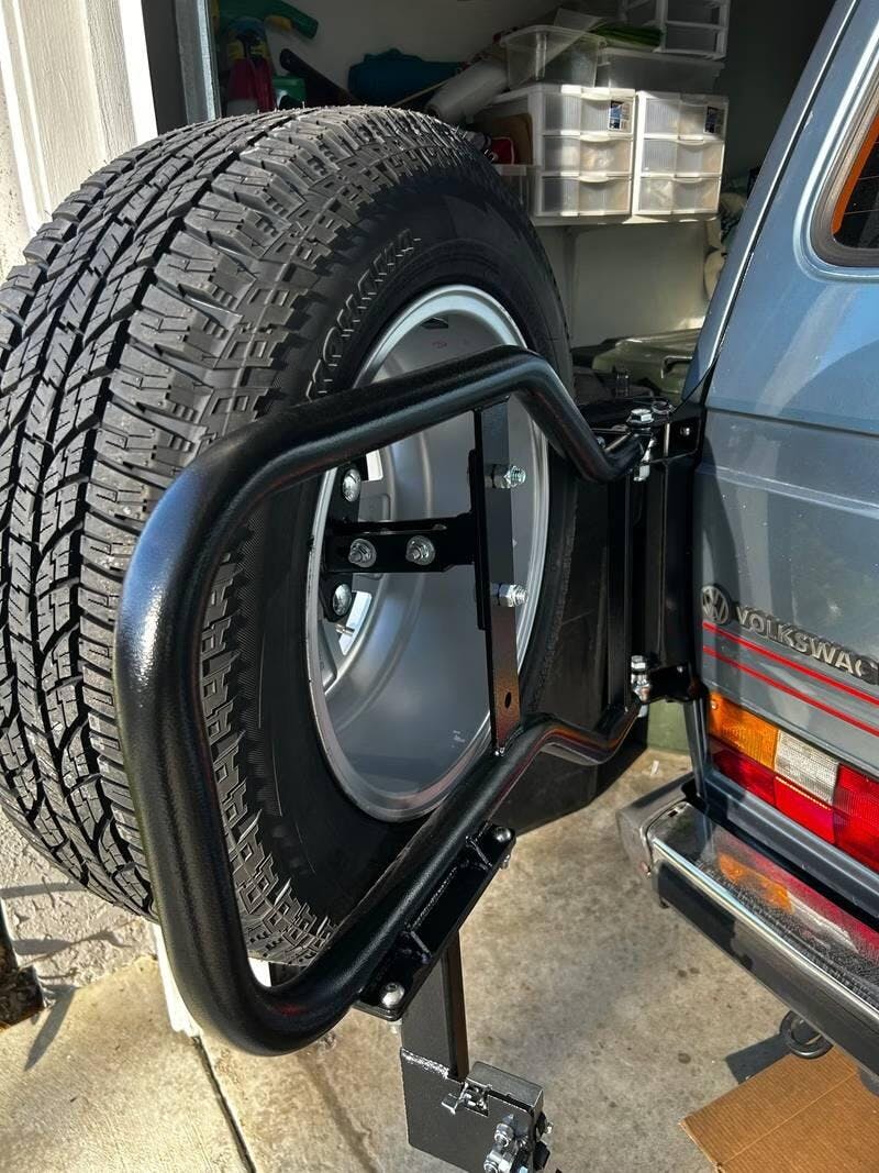 3) Purchase (1) extra wheel of the same size you are installing on the vehicle, mount the same size tire on it, and carry it on the rear with one of our Universal Carriers! Note: This is the only option if you have a Syncro without a driveshaft decoupler, in which case all four tires on the ground must be close to the same diameter to avoid binding and potential transaxle damage.