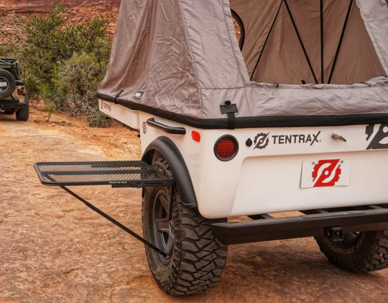 This is the standard aluminum camping table from Tail Gater Tire Table. This table measures approximately 33.5" x 28" and sets up easily on one of your tires with no need for tools or a hitch. It features a retractable leg to provide extra stability.