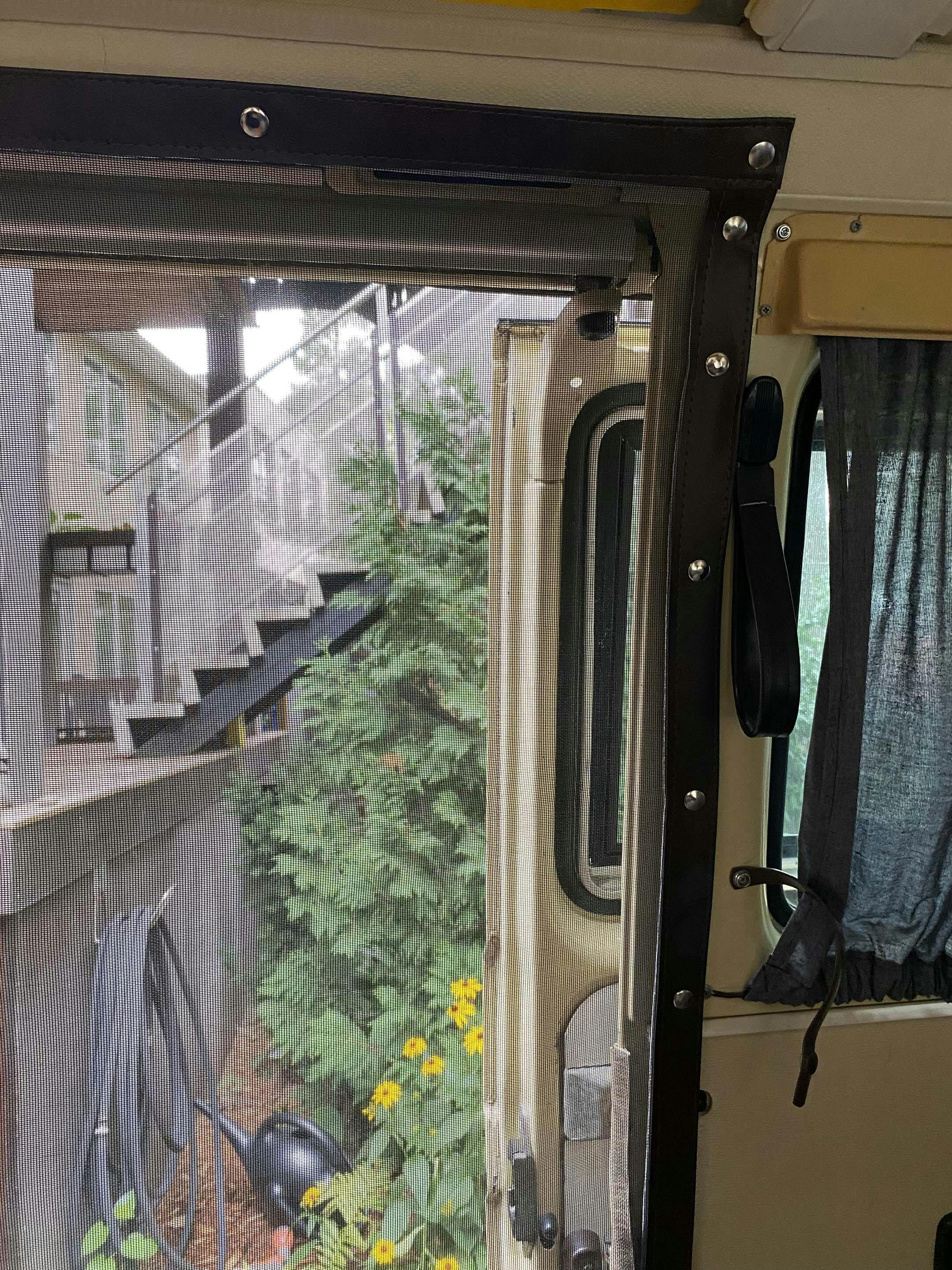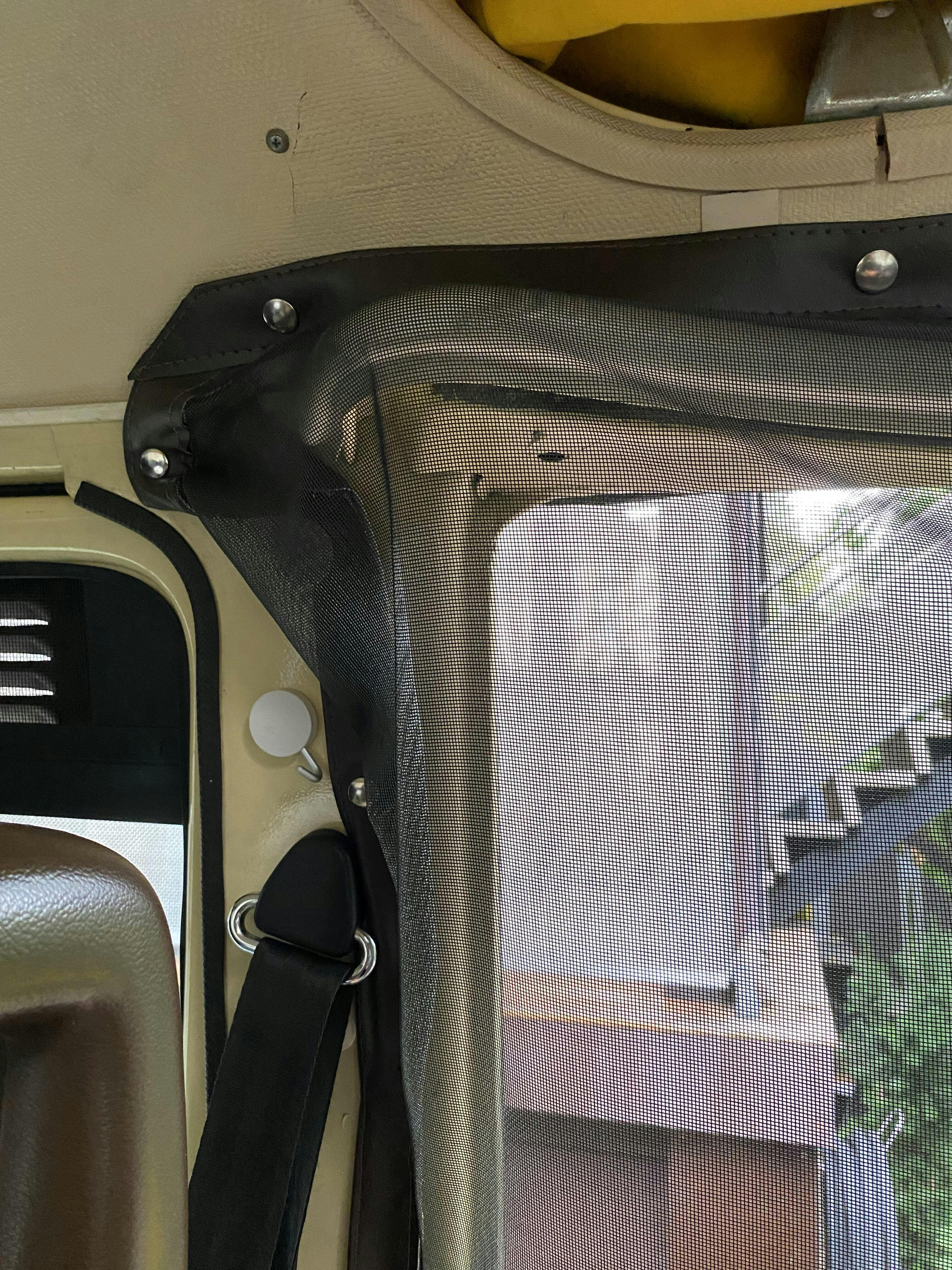 Regarding the screen curtain installation—I positioned the curtain with masking tape. I marked the button snap and screw locations. And then took the curtain down and put in the button snap in the curtain and screwed the base into the van’s walls. It was slow going taking the curtain up, down, checking and rechecking—but the snaps went onto the curtain with the post punch and die provided.